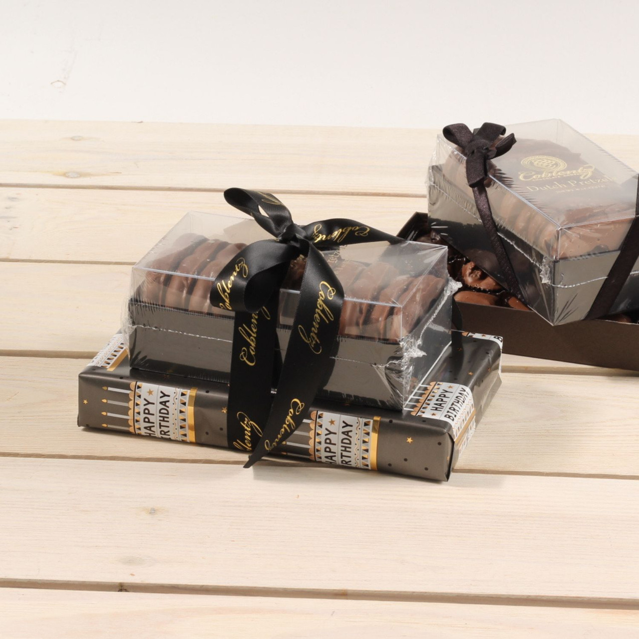 Birthday Celebration Duo consists of our best-selling 1/2 lb. Deluxe Assortment, which is a combination of mostly milk chocolate creams, clusters, caramels and meltaways with a few pieces of dark chocolate mixed in, and a package of 7 oz. Milk Chocolate Dutch Pretzel Gift Box. This duo is wrapped and trimmed with a Coblentz ribbon and ready to gift. Each order includes 1 Deluxe Assortment and 1 Box of Chocolate Pretzels, tied and trimmed with a birthday theme.