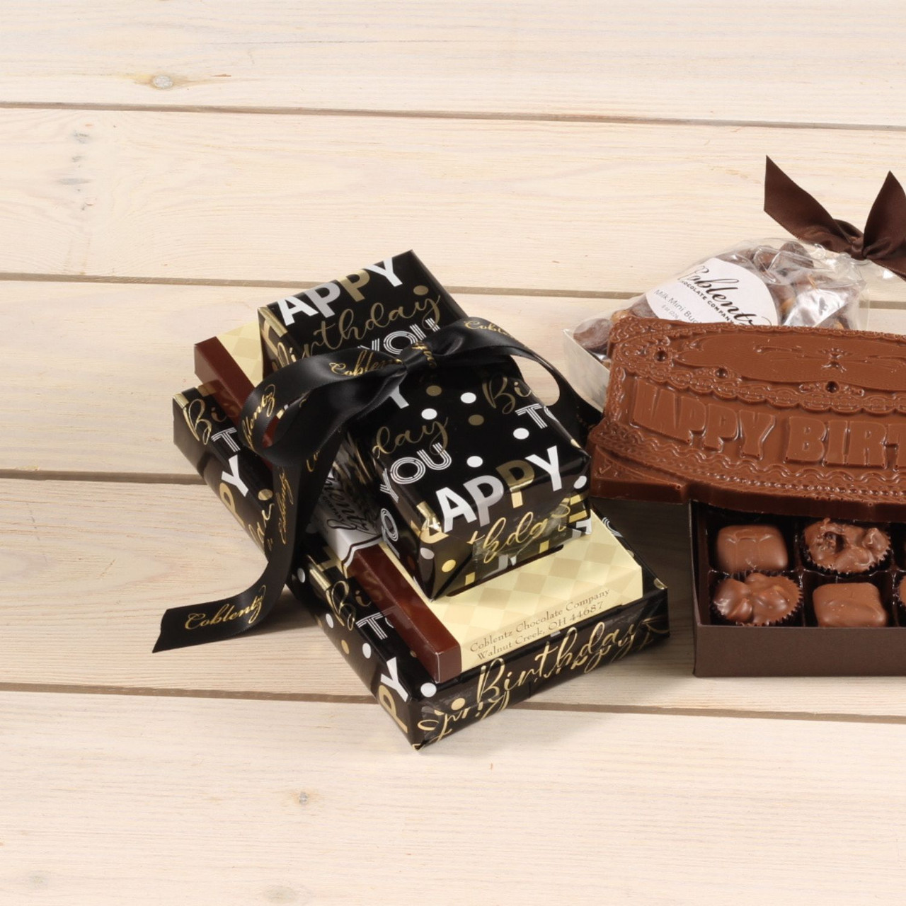 The Birthday Celebration Trio is a 1/2 lb. Deluxe Assortment gift box which is a mostly milk chocolate assortment of caramels, creams, clusters and meltaways with a few pieces of dark chocolate mixed in, a 6 oz. solid Milk Chocolate Happy Birthday Bar and Mini Milk Chocolate Buckeyes. The trio is wrapped and trimmed with Coblentz ribbon and ready for birthday-giving. Each order contains 1 trio.